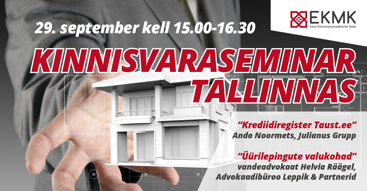 Kutsume Teid osalema Eesti Kinnisvaramaaklerite Koja ja Tallinna Ülikooli seminarile 29. septembril, mis toimub Tallinnas Siili 14 (end. Akadeemia Nord). Seminar algab kell 15.00 ja kestab kuni 16.30.