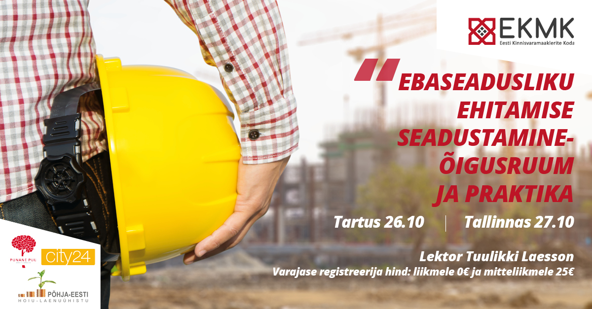 EKMK jätkab oma koolitustesarjaga Tallinnas ja Tartus ning seekord kutsume Teid osalema koolitusele “Ebaseadusliku ehitamise seadustamine - õigusruum ja praktika". Koolituse lektoriks on meile juba tuntud ehitusvaldkonna jurist ja EKMK koostööpartner Tuulikki Laesson.